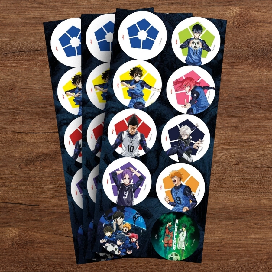 Adesivo redondo, 4x4cm, com estampa temática Bluelock. Produto ideal para decorar cadernos, lembrancinhas, embalagens e itens de festas, proporcionando diversão e personalização ao ambiente.