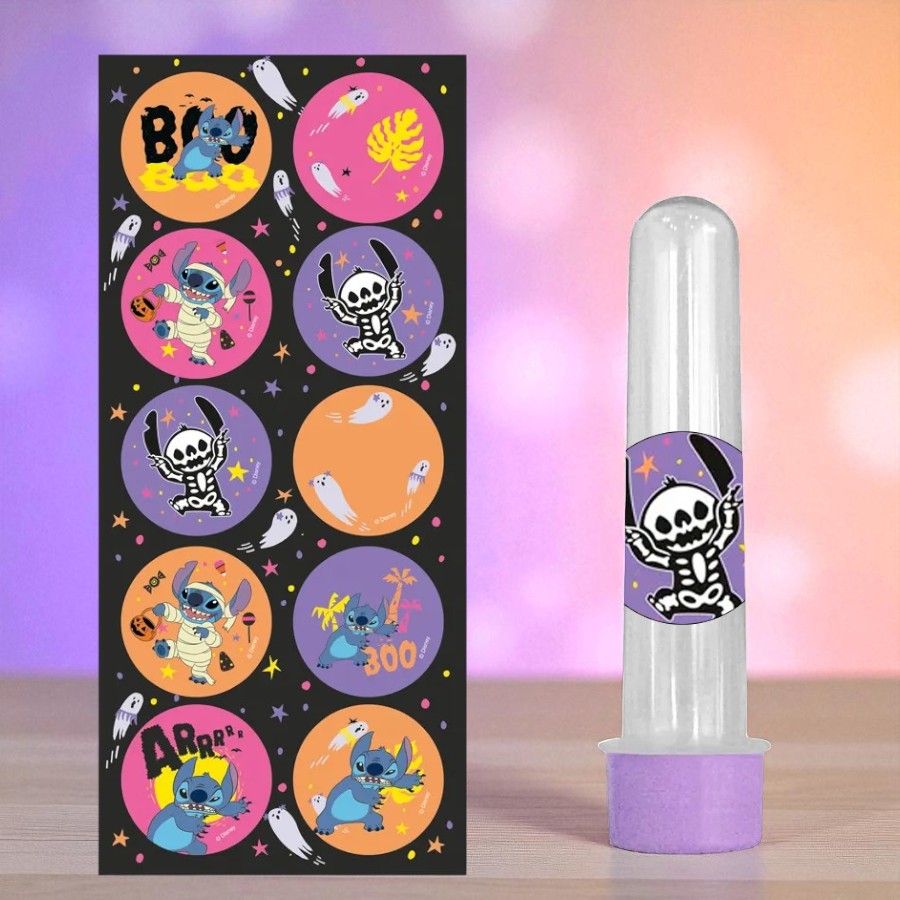 O Adesivo Redondo Stitch Halloween é perfeito para transformar suas lembrancinhas e embalagens em algo ainda mais especial. Com 4x4cm, ele é ideal para colar em tubetes, latinhas para doces de Halloween, caixinhas e para fazer o fechamento de embalagens temáticas. Inspirado no Stitch Disney, esse adesivo traz um toque divertido e festivo para suas decorações de Halloween Disney.