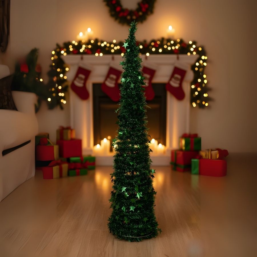 Árvore de Natal extensível de 1,5m com estrela, ideal para decorações natalinas completas, práticas e cheias de estilo.