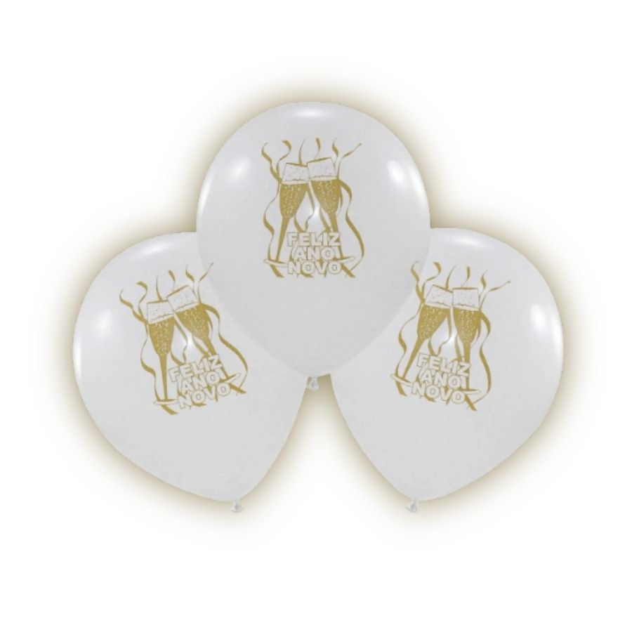 Balão branco decorado com tema de Ano Novo, ideal para festas e comemorações, com estampa “Feliz Ano Novo” e excelente qualidade.