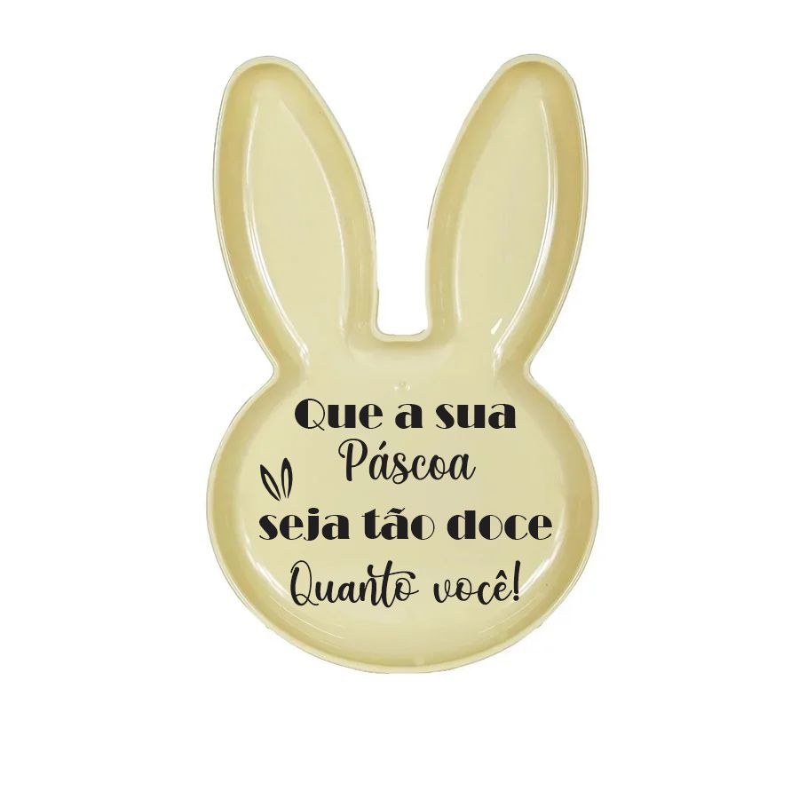Bandeja decorativa com tema de coelho e frase de Páscoa, na cor amarelo, tamanho 25x15 cm. Charmosa e funcional.