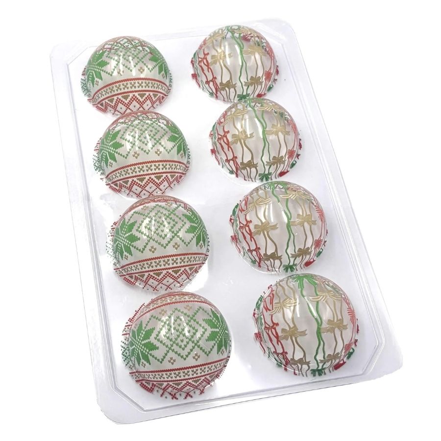 O Blister Decorado com Transfer Para Chocolate - Bola 7 Laços e Mosaico - BLN 0199 é ideal para quem busca criar chocolates personalizados com acabamento bonito e diferenciado. O conjunto possui 8 cavidades, sendo 4 com estampa de laços e 4 com estampa de mosaicos natalinos, em tons de verde, vermelho e bege. Assim que o chocolate é colocado na cavidade, o desenho é transferido diretamente para ele, resultando em chocolates estampados, coloridos e com visual profissional — perfeitos para lembrancinhas, presentes ou produções temáticas de Natal.