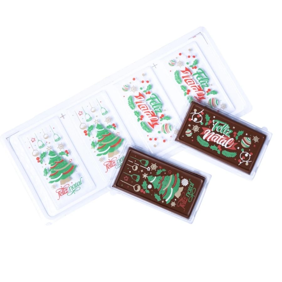 O Blister Decorado com Transfer de Natal Para Chocolate - Tablete Pinheiro e Luz - BLN 0197 é ideal para criar chocolates natalinos detalhados e encantadores. O molde possui cavidades em formato de tabletes, com estampas de pinheiros e luzes de Natal, que são transferidas diretamente para o chocolate durante o preparo, resultando em peças decoradas, coloridas e com acabamento profissional. Perfeito para lembrancinhas, presentes e produções artesanais temáticas.