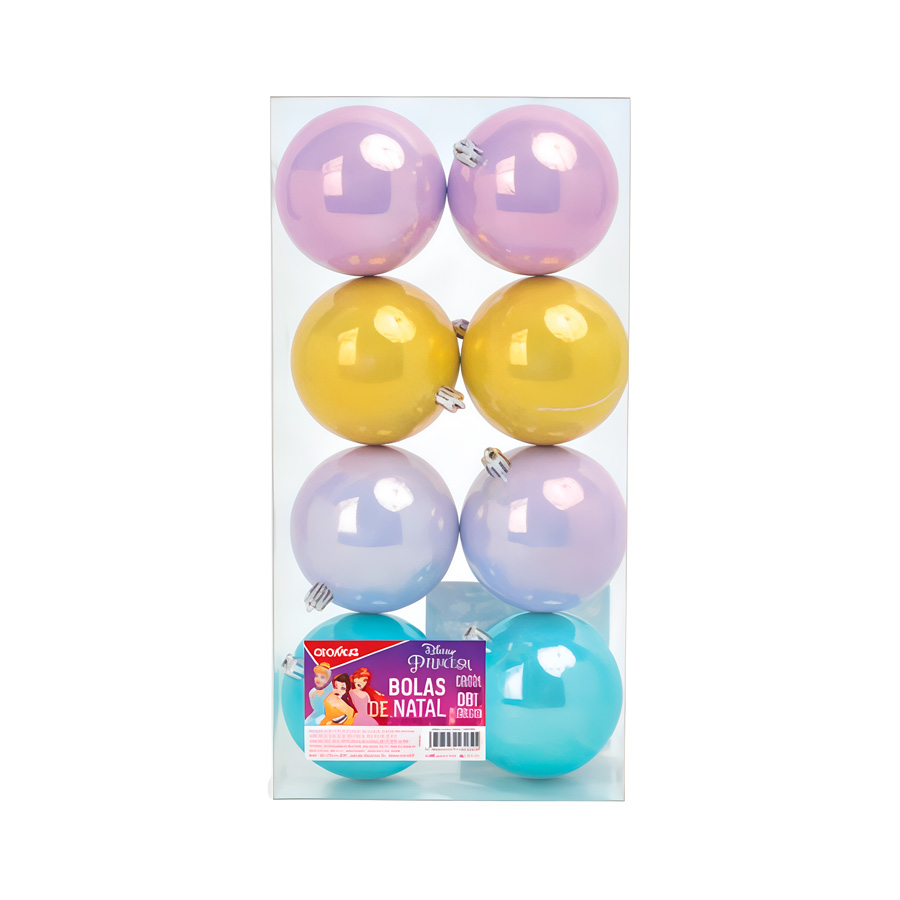 Este pacote inclui 8 bolas de Natal de 8cm de diâmetro, com a temática encantadora das princesas da Disney. As cores variam entre roxo, amarelo, lilás e azul ciano, com duas bolas de cada cor, trazendo uma atmosfera mágica e vibrante para sua decoração natalina.