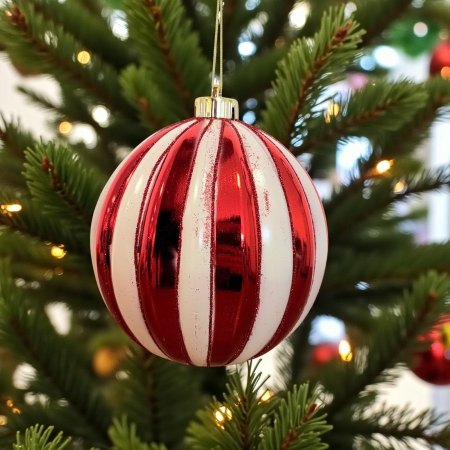 Bola decorativa de Natal vermelha com listras brancas, medindo 15cm de diâmetro. Possui cordão para pendurar e é indicada para árvores, guirlandas, centros de mesa e arranjos natalinos.