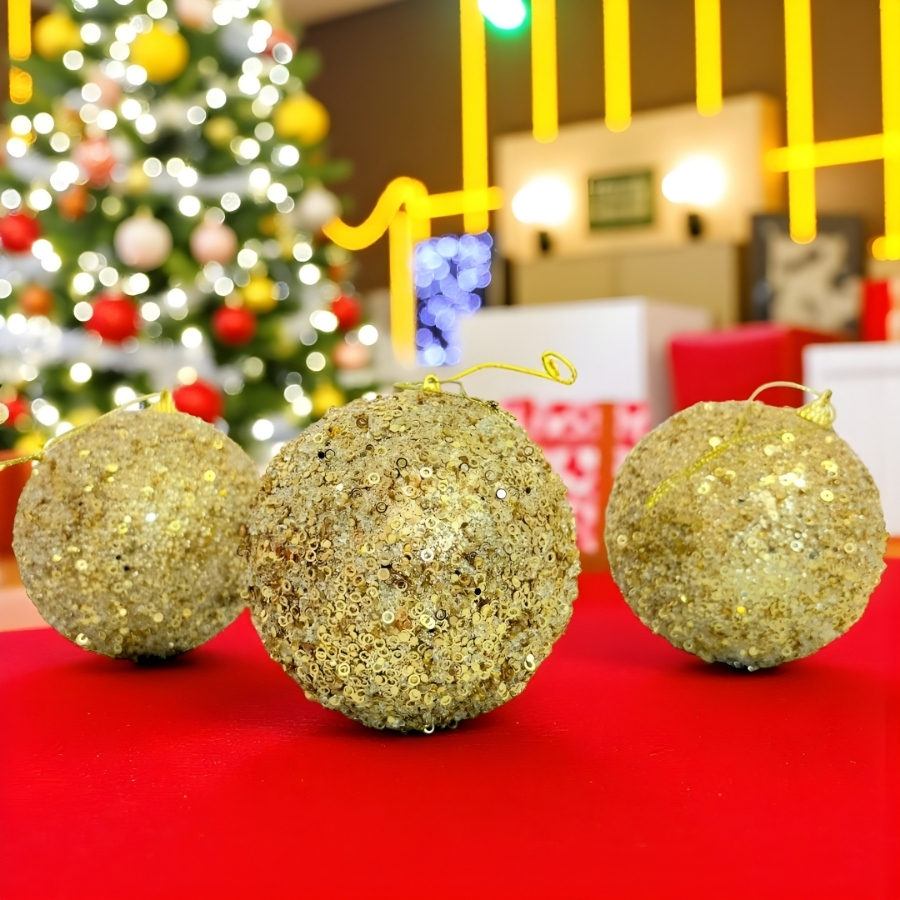 Conjunto de bolas de Natal vermelhas com acabamento em glitter. Cada bola possui 12cm de diâmetro e vem acondicionada em tubo para fácil armazenamento e melhor conservação do produto.