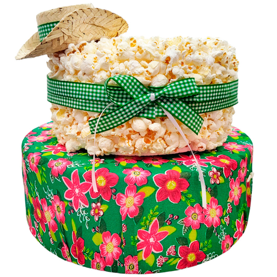 Bolo Decorativo de Festa Junina Pipoca e Tecido Chita, com dimensões de 25,5x29cm, que combina a doçura tradicional de um bolo com a alegria e a nostalgia das festas juninas. Decorado com pipocas crocantes de verdade, este bolo se destaca pela sua aparência colorida e convidativa, perfeito para celebrar as tradições brasileiras com um toque especial e sabor irresistível.