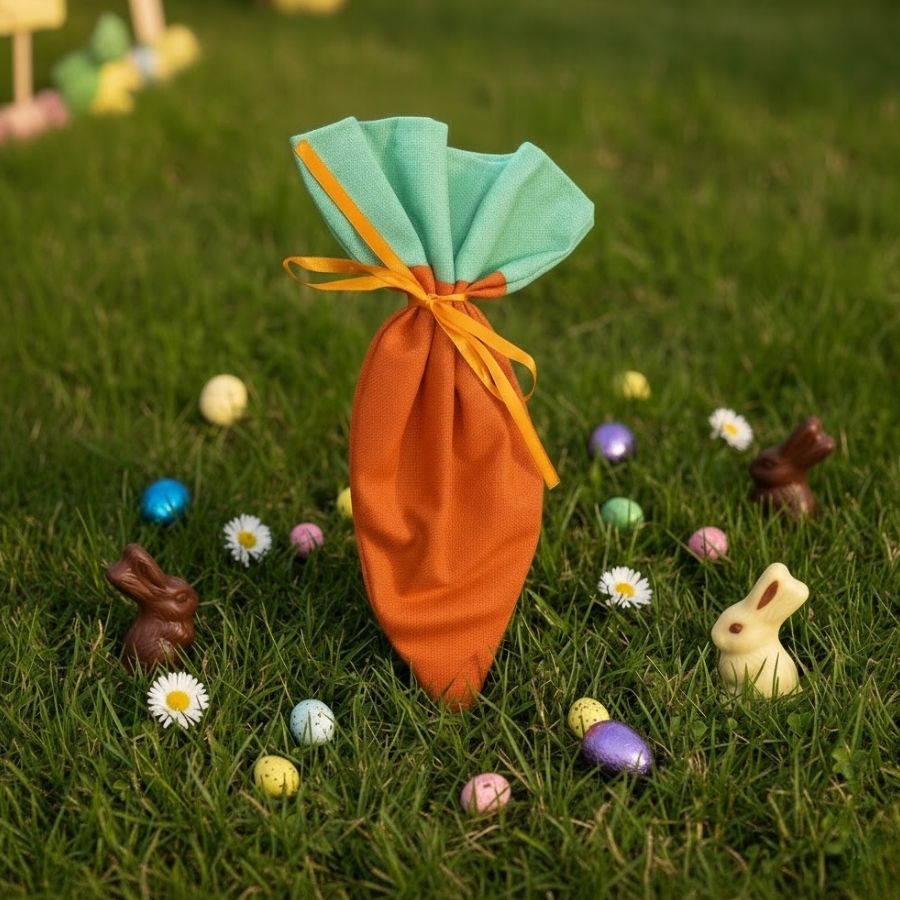 Bolsinha de tecido em formato de cenoura, com fechamento em laço de cetim, disponível em quatro tamanhos. Ideal para presentear ou decorar na Páscoa com chocolates, doces e lembrancinhas.