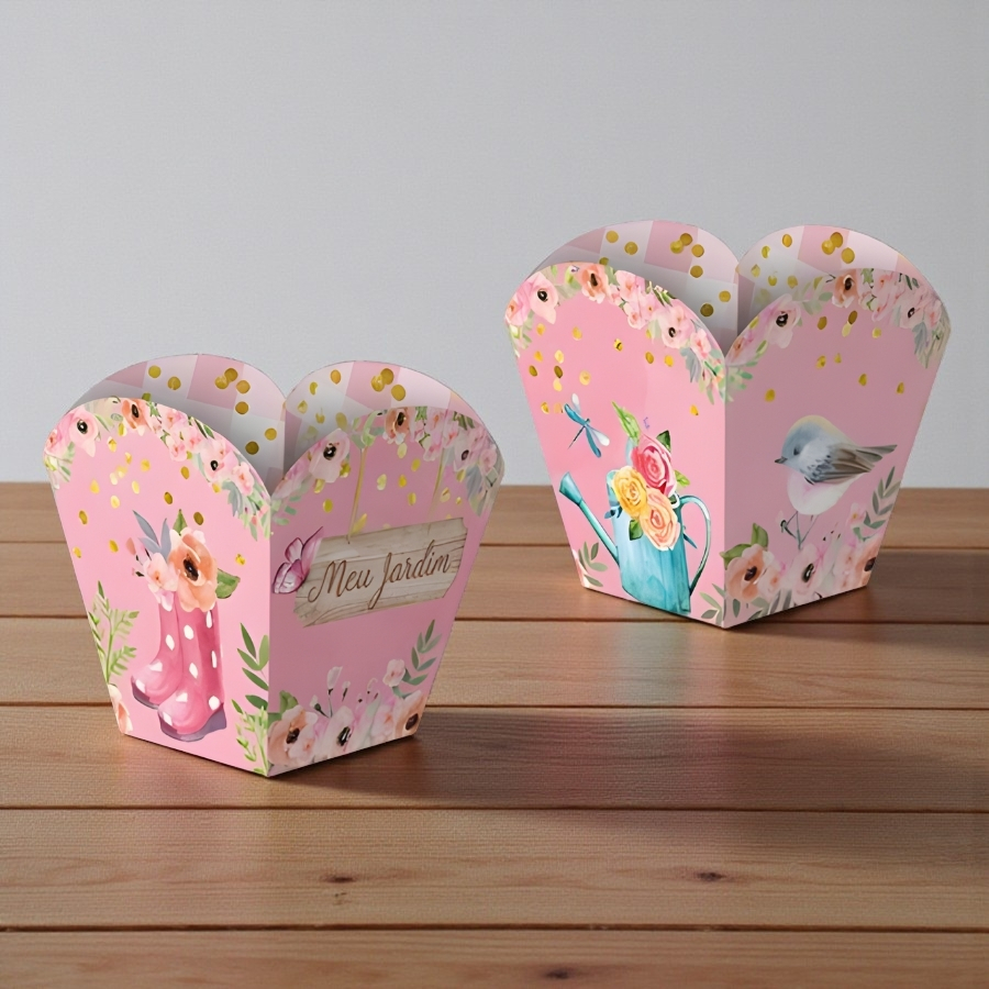Produzido em papel cartão resistente, o cachepot é ideal para acomodar doces, lembrancinhas, balas ou pequenas flores decorativas. Sua estrutura firme e design temático garantem praticidade e beleza, combinando perfeitamente com outros artigos da linha Meu Jardim.