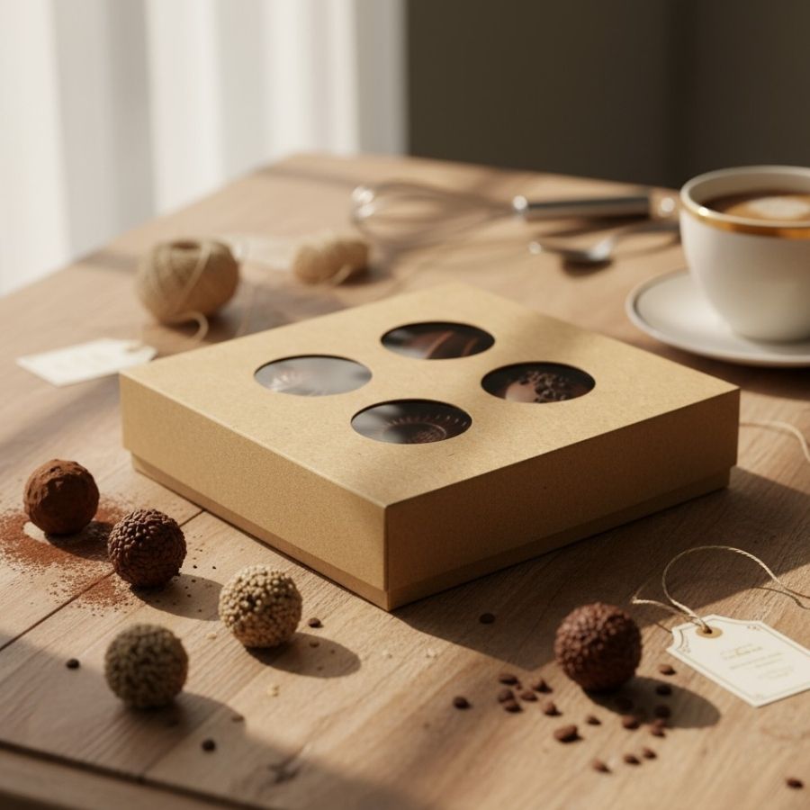 Caixa kraft para 4 doces com luva vazada, ideal para confeitaria, presentes e lembranças artesanais.