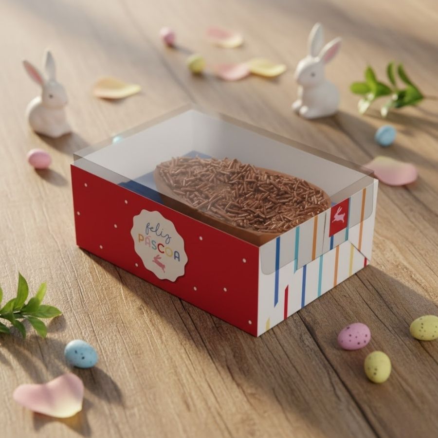 Caixa em papel cartão resistente para acomodar meios ovos de Páscoa de 250g, 350g ou 500g, ideal para lembrancinhas, kits e apresentações personalizadas.