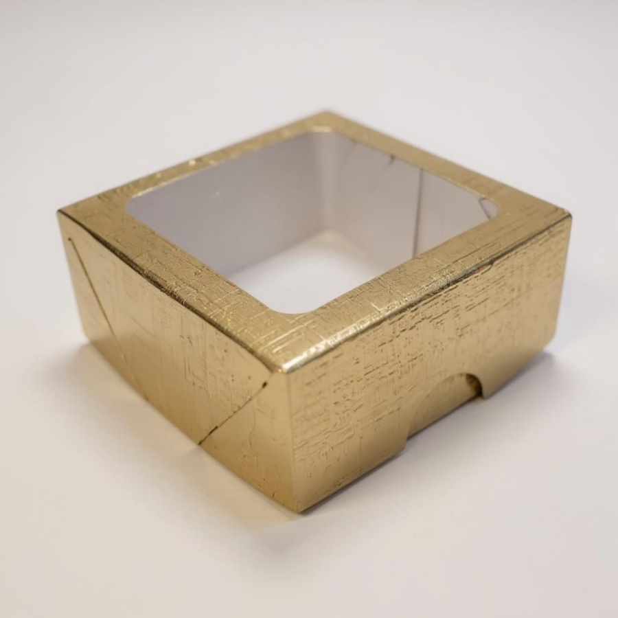 Caixa modelo S16 com visor na tampa, fabricada em papel cartão resistente com acabamento ouro texturizado. Medidas aproximadas: 7cm x 7cm x 3cm. Possui estrutura firme e é fácil de montar. Ideal para doces finos, lembranças de casamento, eventos corporativos, kits personalizados e brindes de alto padrão.