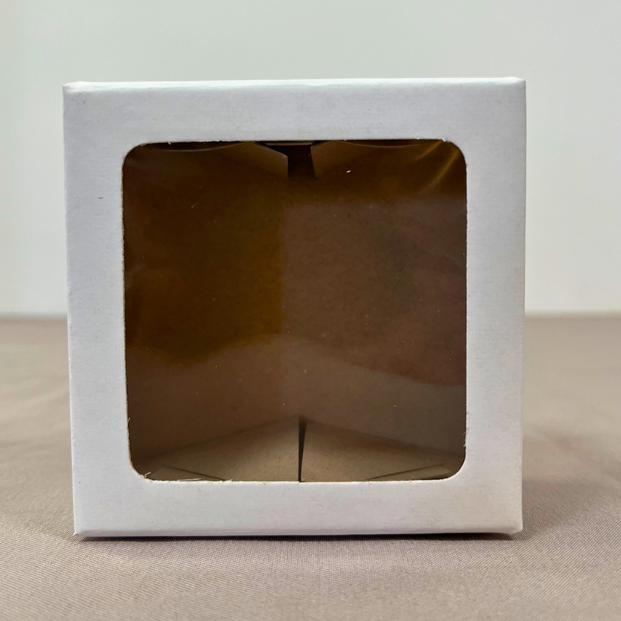 A Caixa com Visor VC8 mede 8cm x 8cm x 4cm, com acabamento branco e visor transparente, oferecendo uma forma prática e charmosa de embalar doces e lembrancinhas com segurança.