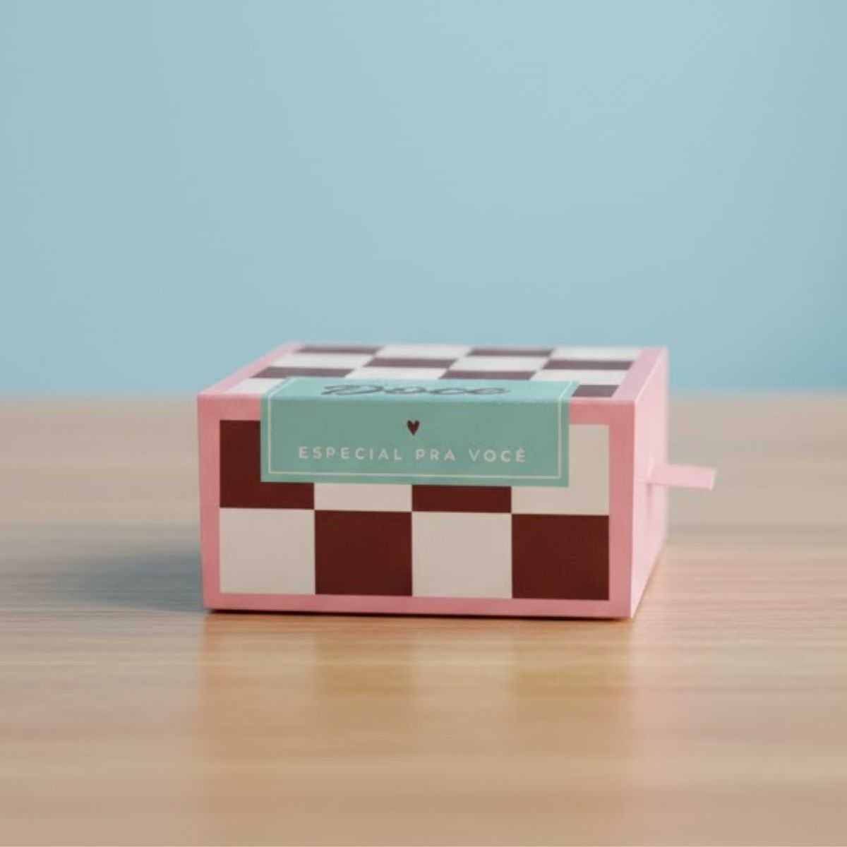 A Caixa Luva Para Docinhos com Puxador - Sucre é uma opção charmosa e moderna para apresentar seus doces e lembrancinhas com muito estilo. Com estampa quadriculada em branco e preto na parte externa e borda rosa delicada, essa caixinha se destaca pelo design elegante e criativo. O interior é rosa, com a área dos docinhos em verde água, criando uma combinação de cores harmoniosa e encantadora. O kit contém 10 unidades, perfeitas para quem busca praticidade e bom gosto na hora de montar lembranças.