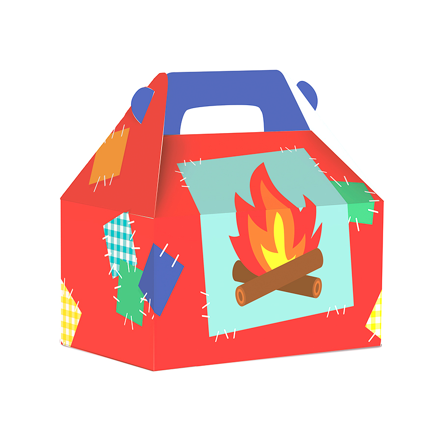Caixa de papel em formato de maleta, com temática de festa junina.