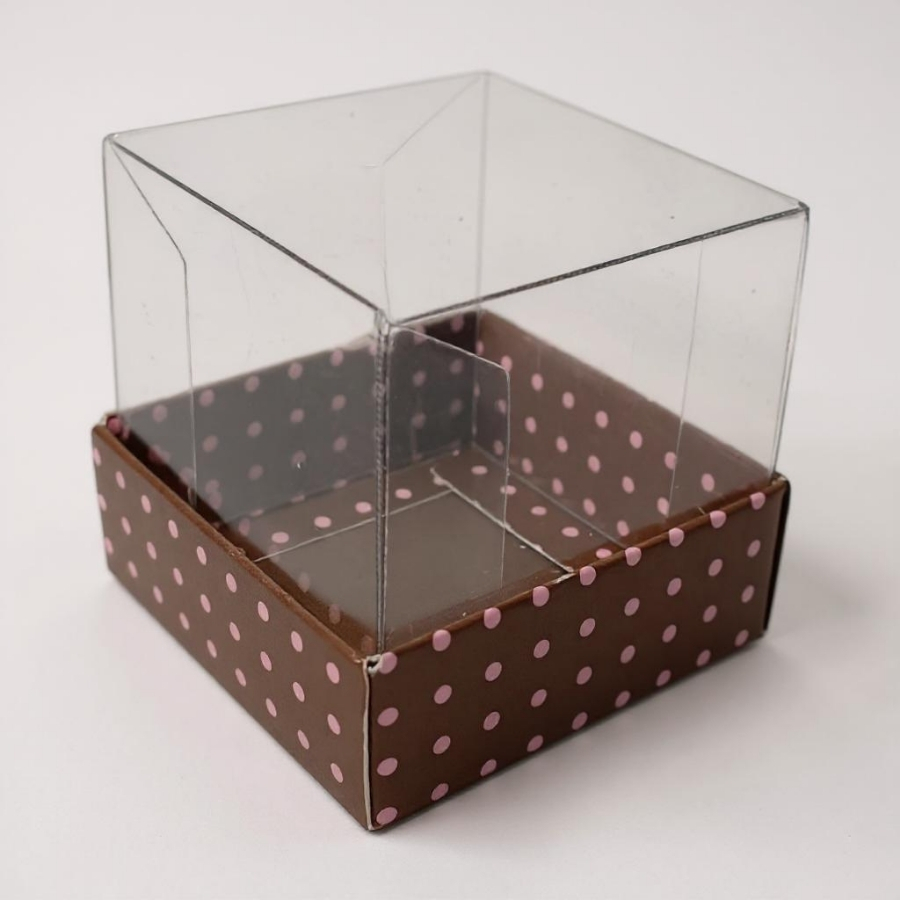 Caixa para mini bolo no tamanho P (5x5x5cm), na cor marrom com bolinhas rosas. Ideal para lembrancinhas e doces finos.