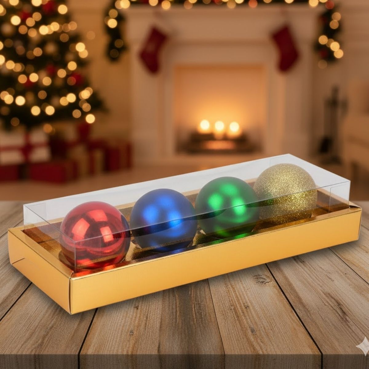 A Caixa Para Bolas de Natal de Chocolate Dourada é ideal para quem deseja dar um toque sofisticado e festivo às suas criações natalinas. Com acabamento dourado brilhante e estrutura firme, ela acomoda 4 bolas de chocolate com 5cm de diâmetro cada, mantendo os doces bem posicionados e protegidos. Essa caixa é compatível com as formas da BWB em formato de bola de Natal, garantindo encaixe perfeito e apresentação impecável.