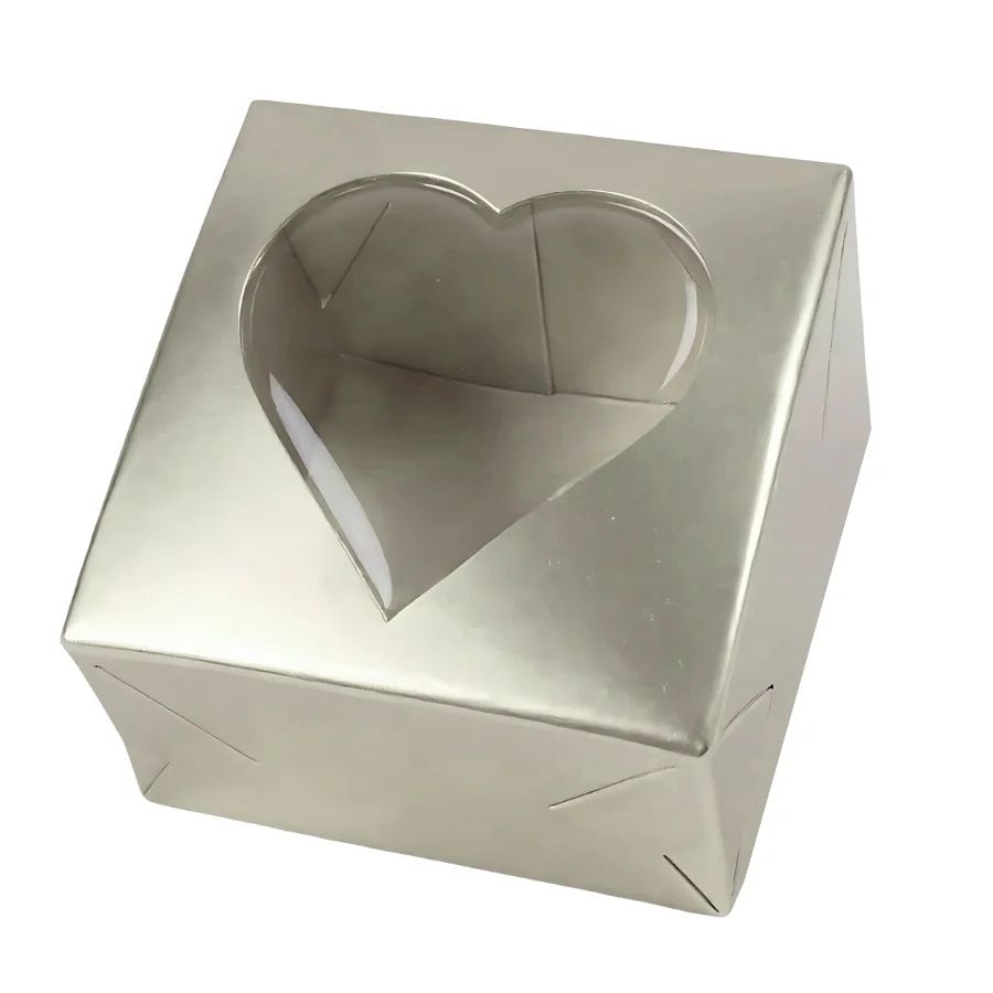Produzida em papel cartão na cor prata, com acabamento moderno e refinado, esta caixa possui visor em acetato no formato de coração, que valoriza o conteúdo interno e facilita a visualização do item. Suas medidas são 5,5x5x3cm, ideais para doces pequenos ou lembranças delicadas. Uma embalagem versátil para diferentes ocasiões.