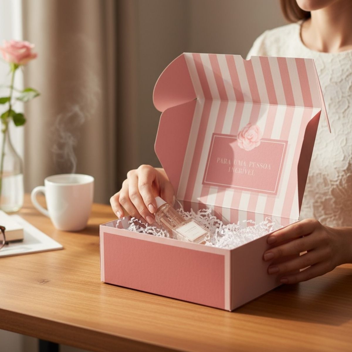 Acomode o presente com papel de seda, fita ou enchimento decorativo. Feche a tampa e finalize com um laço para dar um toque ainda mais elegante e delicado.