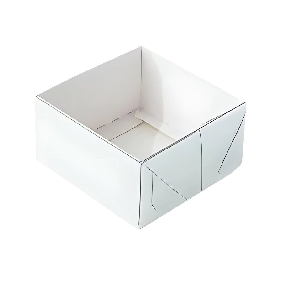Caixa desmontável, com base branca de cartão e tampa em acetato transparente. Medidas: 6,5 × 6,5 × 3 cm. Ideal para acomodar doces finos com segurança, praticidade e apelo visual profissional.
