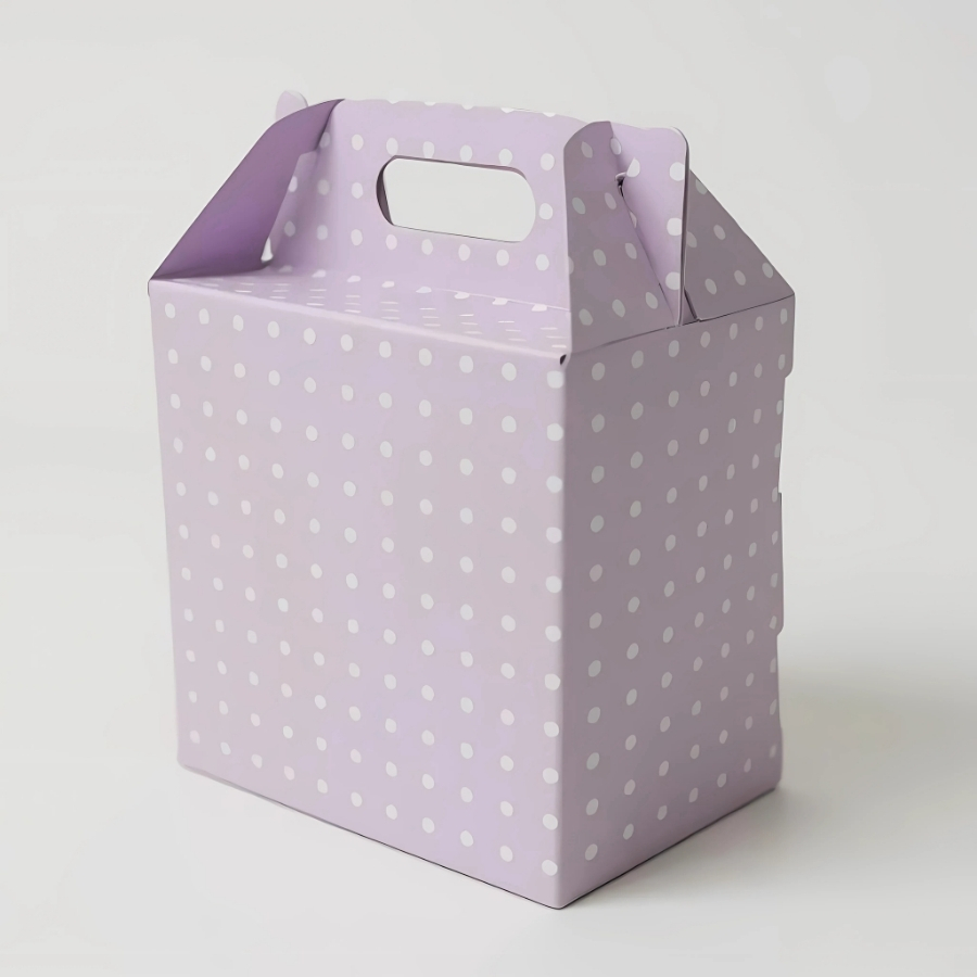 A Caixa Sacolinha S1 mede 9,5x6,5x4,5cm, feita em papel cartão lilás com estampa de bolinhas brancas. Possui fechamento estilo sacolinha com alças integradas. É ideal para acondicionar doces, pequenos brindes ou lembranças em festas e eventos diversos.
