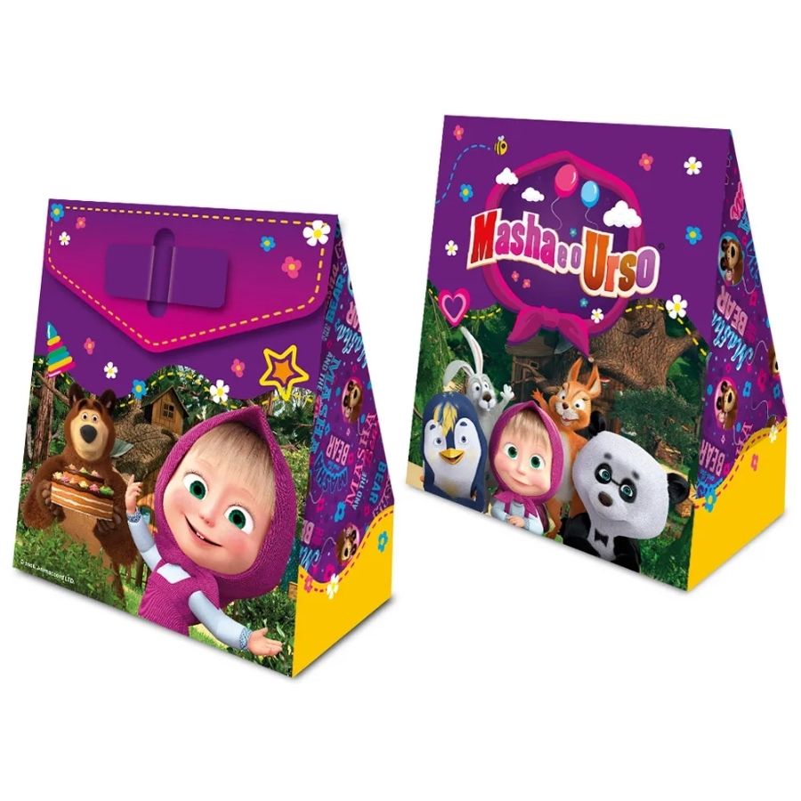 Caixa surpresa com tema Masha e o Urso, medindo 19x20cm. Ideal para festas infantis, é perfeita para embalar doces, lembrancinhas ou pequenos brindes com um toque encantador e temático.