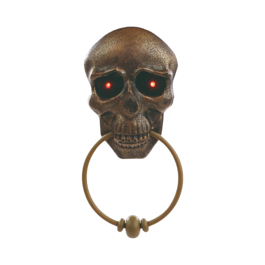 Campainha batedor decorativa de halloween, com design de uma caveira mordendo uma alça para bater na porta, a campainha possui luzes vermelhas nos olhos, faz som, e funciona a 3 pilha AA