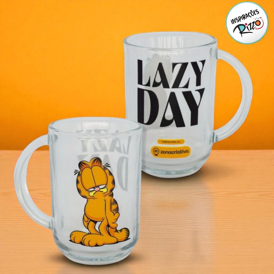 Caneca Verona Garfield – 300ml — feita em vidro transparente, traz de um lado a estampa do icônico Garfield e, do outro, a frase "Lazy Day", perfeita para quem ama um momento de descanso com estilo e bom humor.