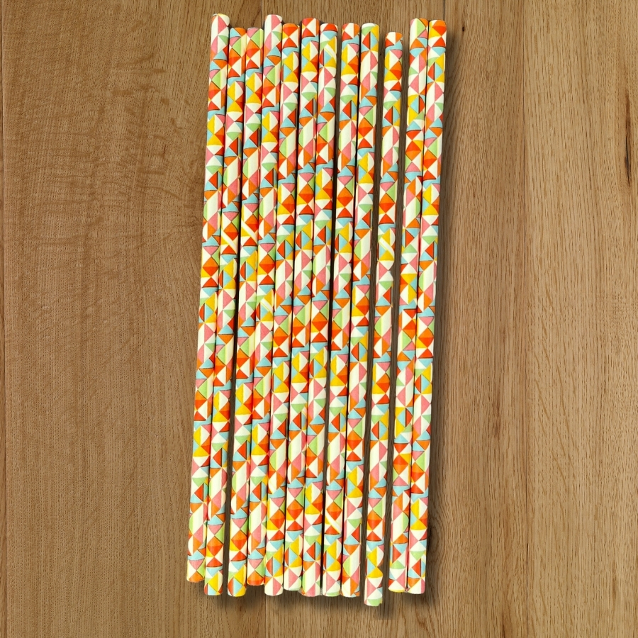 Canudo de papel com cores alegres, ideal para servir bebidas e compor a decoração de festas juninas com charme e responsabilidade ambiental.