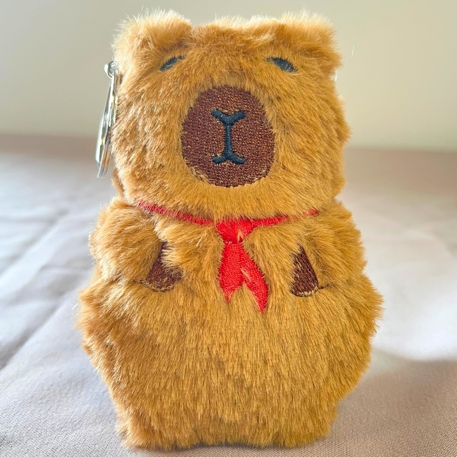 Capivara Chaveiro de Pelúcia com Espelho Duplo é um acessório criativo e prático. Mede 10x8,5cm, tem espelho interno e vem com lenço vermelho decorativo. Ideal para bolsas, mochilas ou para presentear.