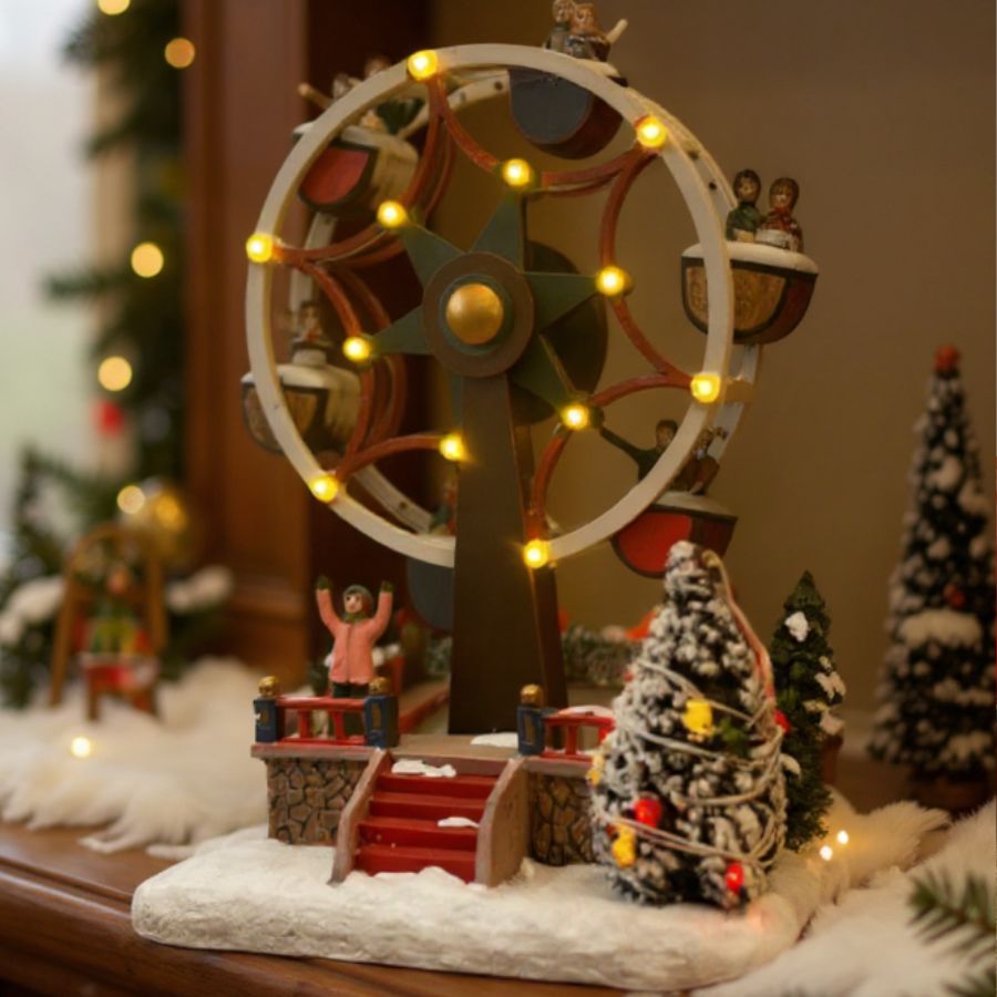 Ideal para vilarejos natalinos, mesas decoradas, aparadores e vitrines, o cenário adiciona brilho, som e movimento à sua decoração, tornando-se o ponto de destaque das comemorações. A roda gigante giratória simboliza diversão e alegria, criando uma atmosfera acolhedora e cheia de vida.