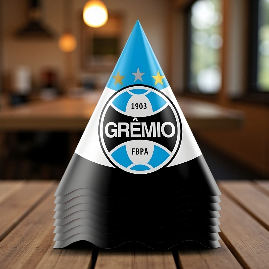 O chapéu é confeccionado no tamanho 16x13cm e apresenta estampa temática do Grêmio. É leve, fácil de usar e ideal para aniversários, eventos temáticos e comemorações de torcedores, oferecendo praticidade e um visual animado.