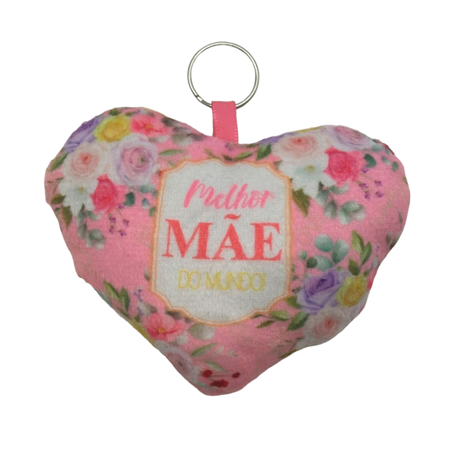 Chaveiro de metal com almofada com formato de coração com estampa florida com fundo rosa destacando um espaço no meio com a frase "Melhor mãe do mundo!"