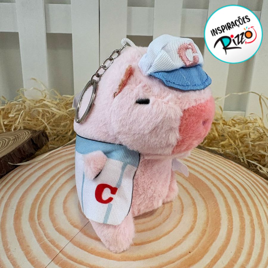 Chaveiro de Pelúcia Capivara Rosa com Jaqueta e Boné 13cm, um acessório fofo e estiloso para decorar bolsas e mochilas.