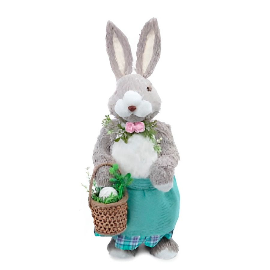 A Coelha Decorativa Grande em pé, vestindo uma saia verde-água, colar de flores e segurando uma cesta de ovos, é uma peça encantadora que adiciona um toque elegante e primaveril à decoração. Com sua postura graciosa e os detalhes cuidadosamente escolhidos, essa coelha cria uma atmosfera delicada e encantadora.