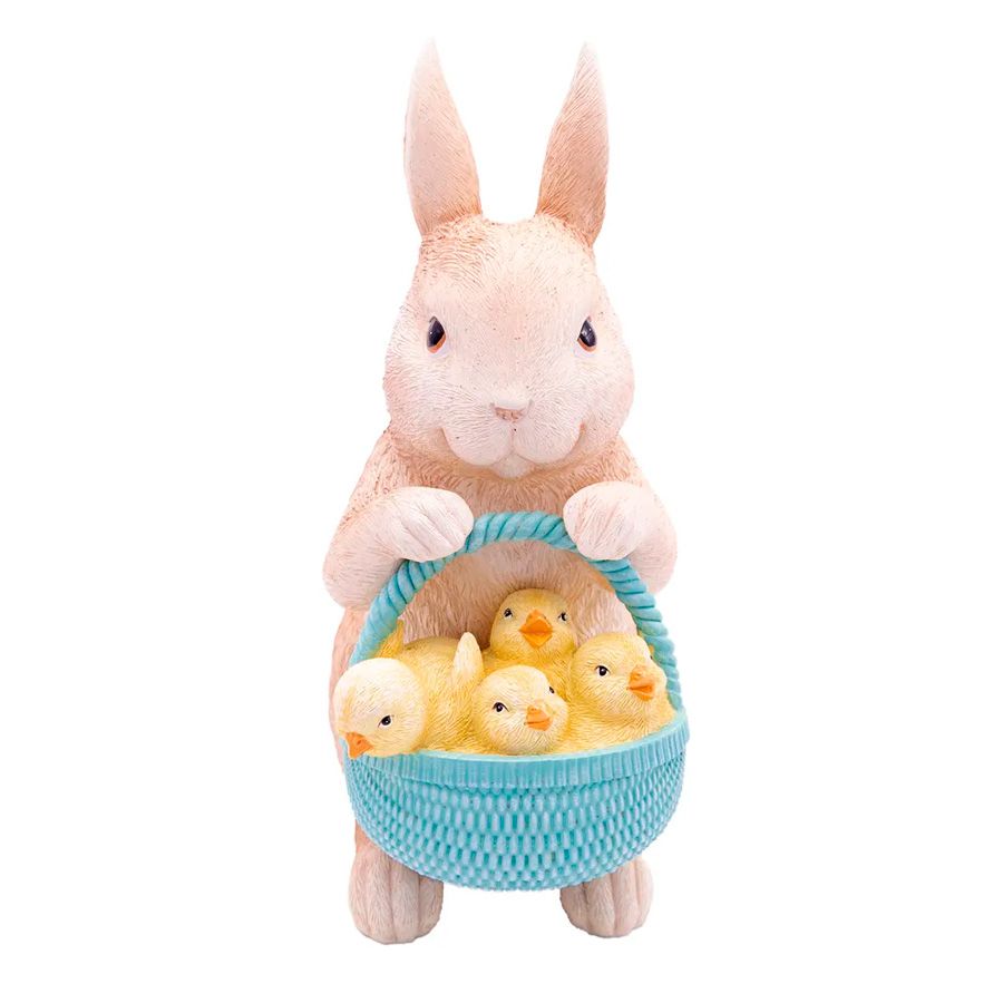 A adição da cesta de patinhos não apenas acentua a ternura do coelho, mas também acrescenta um toque lúdico à peça. Esta escultura decorativa não só atrai a atenção visual, mas também evoca uma sensação de calor e afeto. O Coelho Decorativo com Cesta de Patinhos é uma escolha encantadora para decorar prateleiras, mesas ou qualquer espaço que busque uma peça que celebre a delicadeza da natureza e da infância.