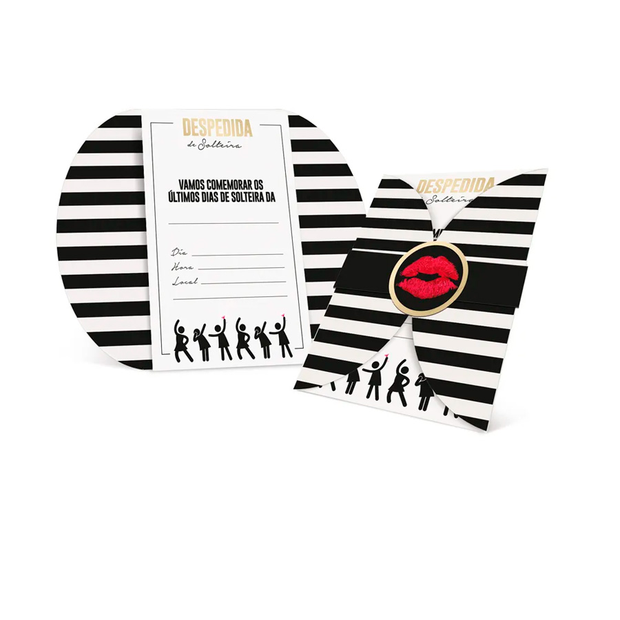 Confeccionados em papel cartão de alta qualidade, os convites ostentam um design temático e elegante, com cores vibrantes e estampas que remetem à alegria da celebração. A frase "Vamos comemorar os últimos dias de solteira da ....(espaço para indicar nome)" destaca-se no centro do convite, convidando as amigas da noiva para participarem dessa festa memorável. Os convites oferecem espaço para personalizar com os detalhes da festa, como dia, hora e local, garantindo que todas as informações importantes sejam facilmente encontradas pelas convidadas. Um fechamento de papel cartão listrado complementa o design do convite, adicionando um toque de charme e estilo. Já a cinta de papel cartão, com um beijo de batom destacado em um círculo no meio, é um detalhe divertido e original que simboliza a despedida da vida de solteira.