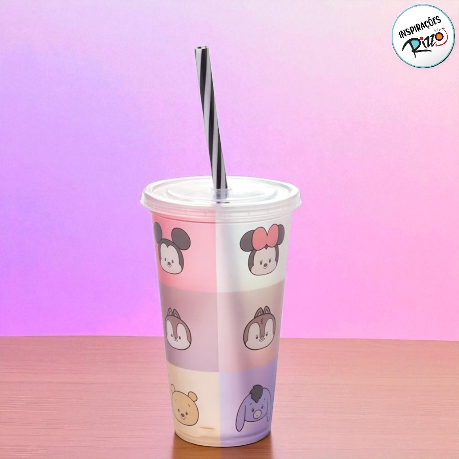 Copo com tampa e canudo, estampa licenciada e inspirada nos personagens Yululun Disney.