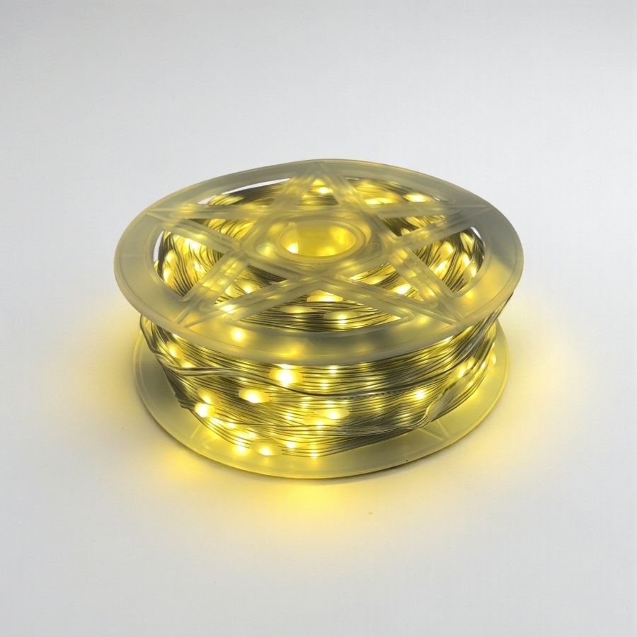 O cordão de LED pisca-pisca blindado de luz branco quente é a solução ideal para criar uma iluminação decorativa marcante em grandes áreas. Com 100 metros de extensão e design com fio transparente, ele proporciona um efeito luminoso elegante e uniforme, sendo perfeito para Natal, festas, casamentos, eventos e para realçar fachadas, varandas e jardins. A tecnologia blindada garante que os fios e as luzes sejam resistentes à chuva, permitindo decorações externas com segurança e durabilidade.