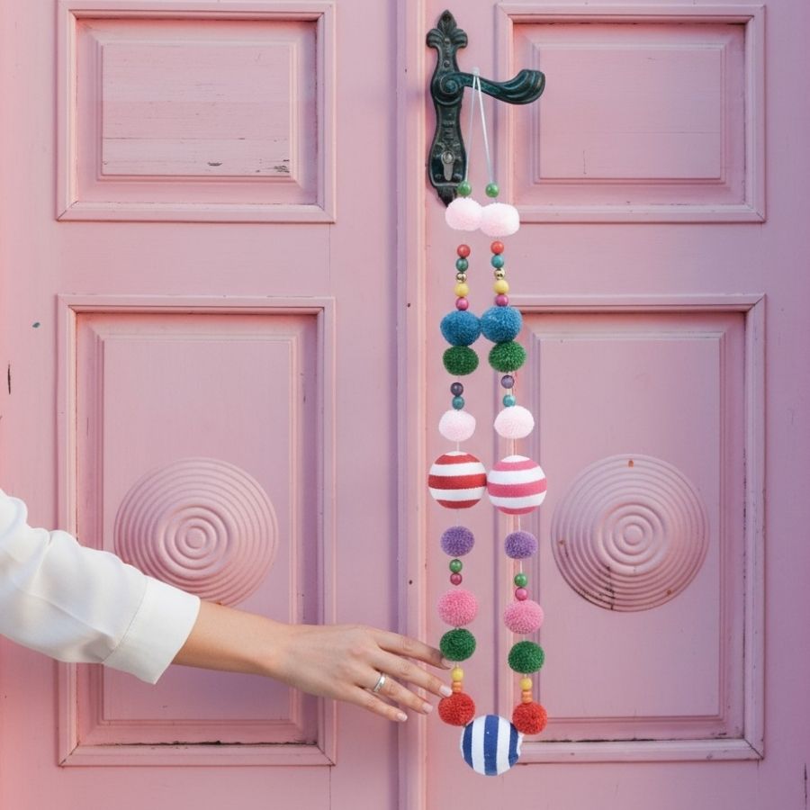 Cordão decorativo colorido com pompons de 130cm, ideal para enfeitar árvores, guirlandas e ambientes natalinos com leveza e criatividade.