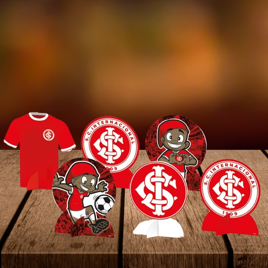 Decoração de mesa com tema do Internacional, dimensões 15x18,5x9cm. Ideal para festas, eventos e comemorações de torcedores, oferecendo praticidade, leveza e visual esportivo.