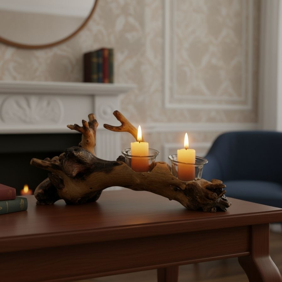 Produzida artesanalmente em madeira natural e vidro, esta peça apresenta variações exclusivas de formato e acabamento, garantindo que cada item seja único. Com visual rústico e elegante, o galho claro com dois castiçais combina com diferentes estilos de decoração, do clássico ao contemporâneo. É perfeito para compor a mesa posta, ambientar salas de estar, quartos ou escritórios, além de ser uma ótima opção para presentear quem aprecia peças diferenciadas e artesanais.