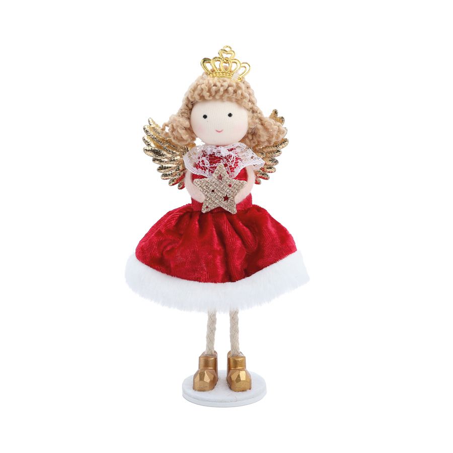 Anjo de natal decorativo em pé com vestimenta vermelha e coroa e estrela na mão