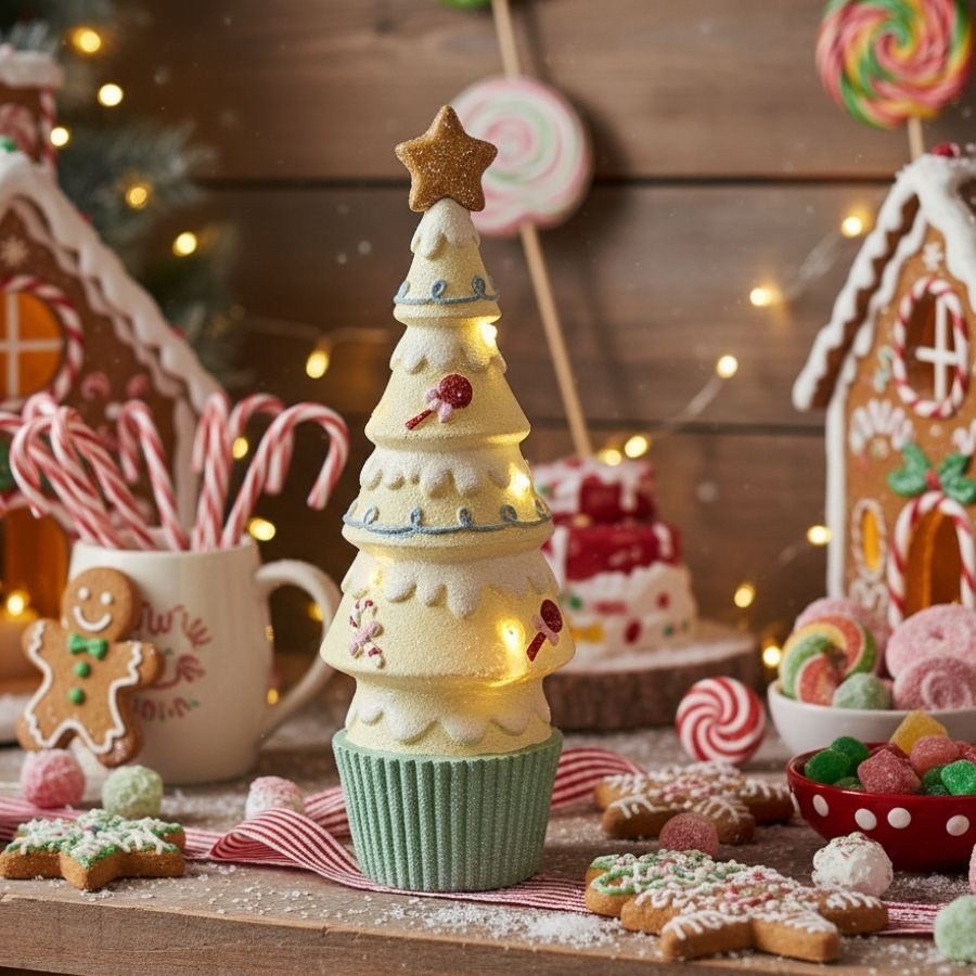 Enfeite natalino em resina de 30cm com formato de árvore de doces e LED quente, ideal para mesas, aparadores e decorações festivas.