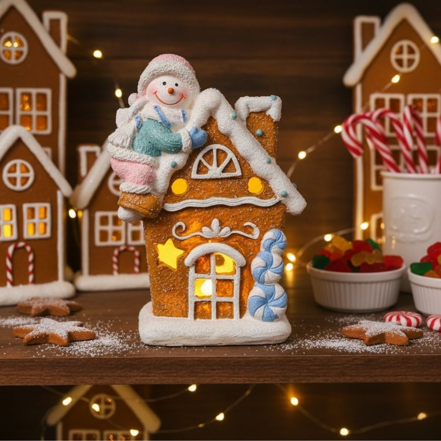 Enfeite natalino em resina de 19,5x14cm em formato de casa Gingerbread com boneco de neve e LED quente, ideal para mesas, aparadores e composições festivas.