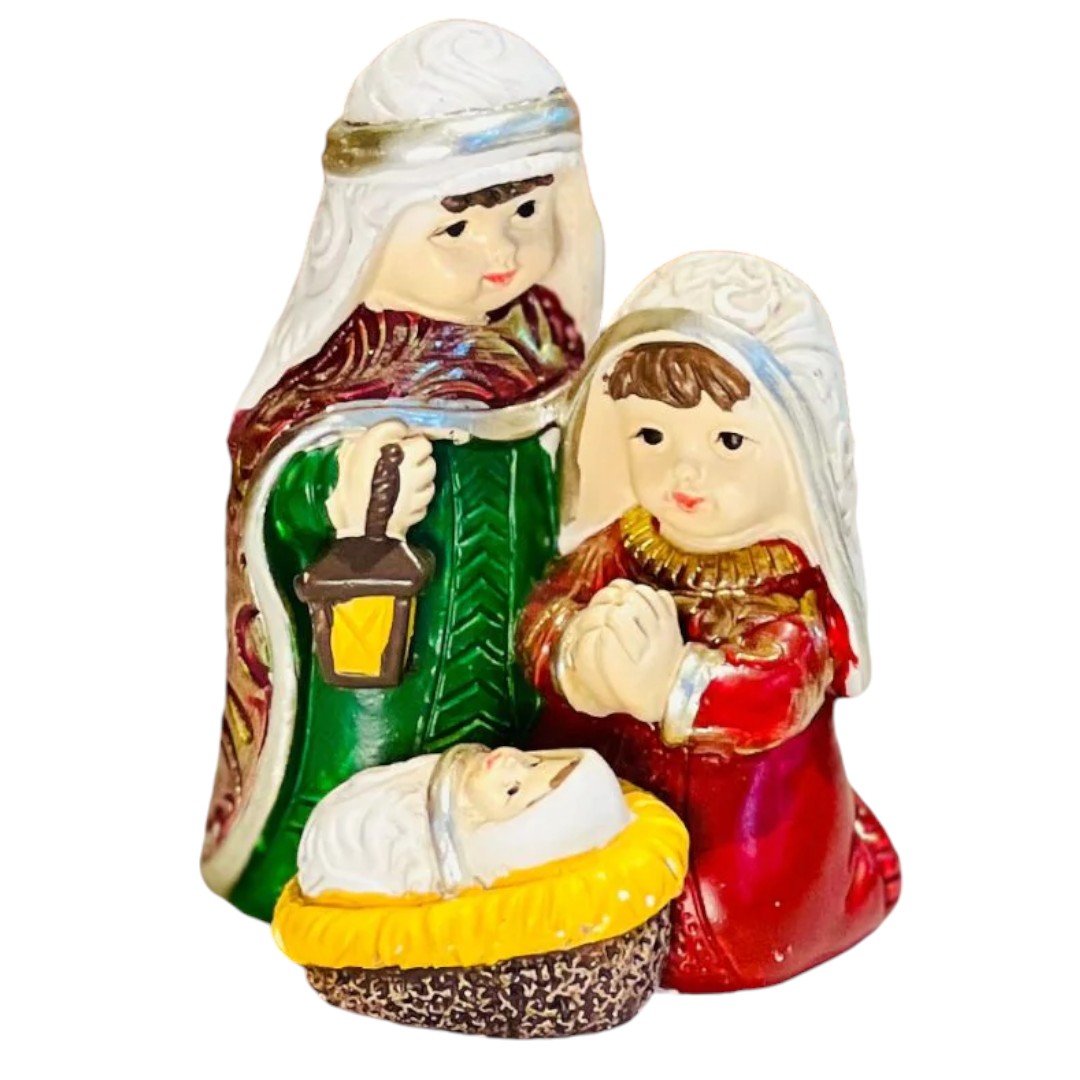 O Enfeite de Natal em Resina da Sagrada Família, medindo 8x6cm, é uma peça compacta e charmosa, ideal para trazer o espírito natalino para a sua casa. Este enfeite é perfeito para compor pequenos presépios ou ser utilizado como destaque em arranjos decorativos, acrescentando um toque de fé e tradição à sua decoração natalina