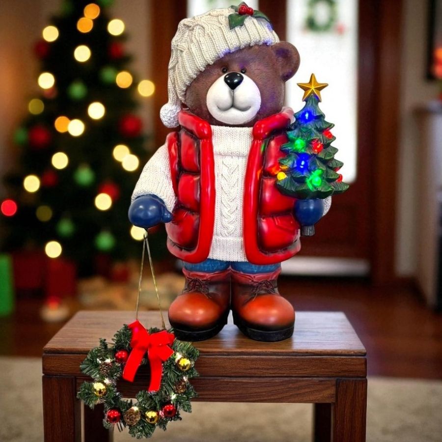 Urso decorativo de Natal com árvore e guirlanda iluminada, ideal para compor decorações natalinas encantadoras em casa ou eventos.