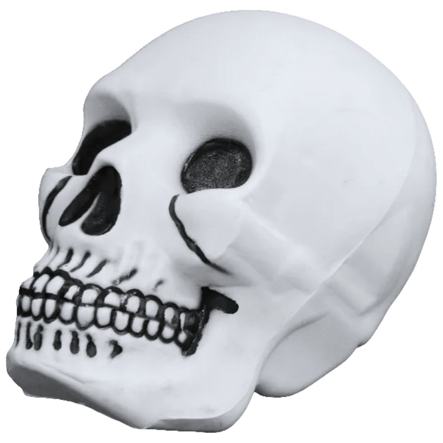Caveira Cabeçuda branca decorativa, com dimensões de 24,5x20cm. Apresenta formato realista, com acabamento em branco fosco e detalhes anatômicos pintados em preto para destacar olhos, nariz e linhas faciais. Um item que combina o clássico visual de caveira com um toque estilizado e impactante.