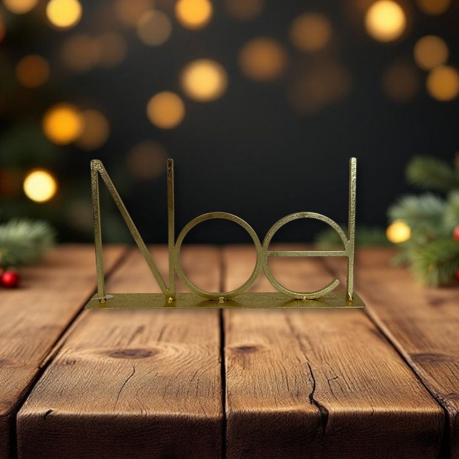 Placa dourada de 13,5cm com a palavra NOEL, perfeita para árvores, guirlandas e decoração natalina sofisticada.