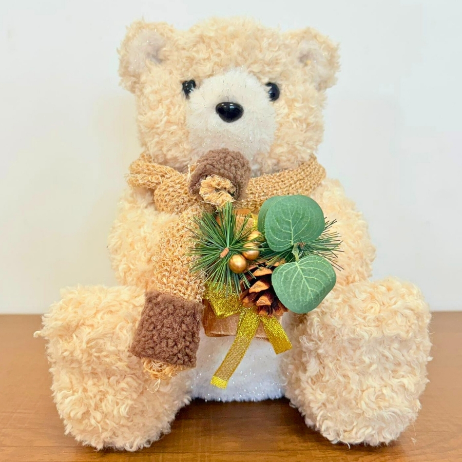 O Urso Sentado Decorativo Bege com Cachecol, Presente e Planta 29x25,5x23cm é uma peça encantadora que transmite aconchego e delicadeza para a decoração. Ele é perfeito para quem busca criar um ambiente natalino diferenciado, resolvendo a dificuldade de compor cenários acolhedores e sofisticados ao mesmo tempo.